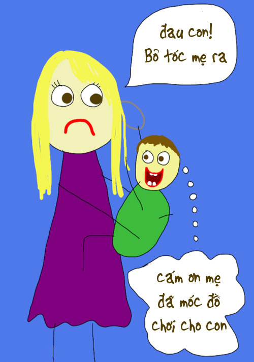 Bắt đầu từ tháng thứ 3, khi biết cầm nắm, tôi luôn luôn không thể để tóc xõa mà bế con được nữa. “Cô nàng Nhím” thường xuyên túm tóc mẹ giật, bất kể khi tôi đang bế con, cho con ti hay nằm cạnh con. Trẻ con có vẻ như coi tóc của mẹ là một món đồ chơi tuyệt vời. Còn tôi thì lúc nào quên không buộc tóc mà bế con thì y như rằng sẽ phải hét lên “Nhím! Bỏ tóc mẹ raaaaa!”. Từ lúc có con, tóc tôi mỏng đi trông thấy